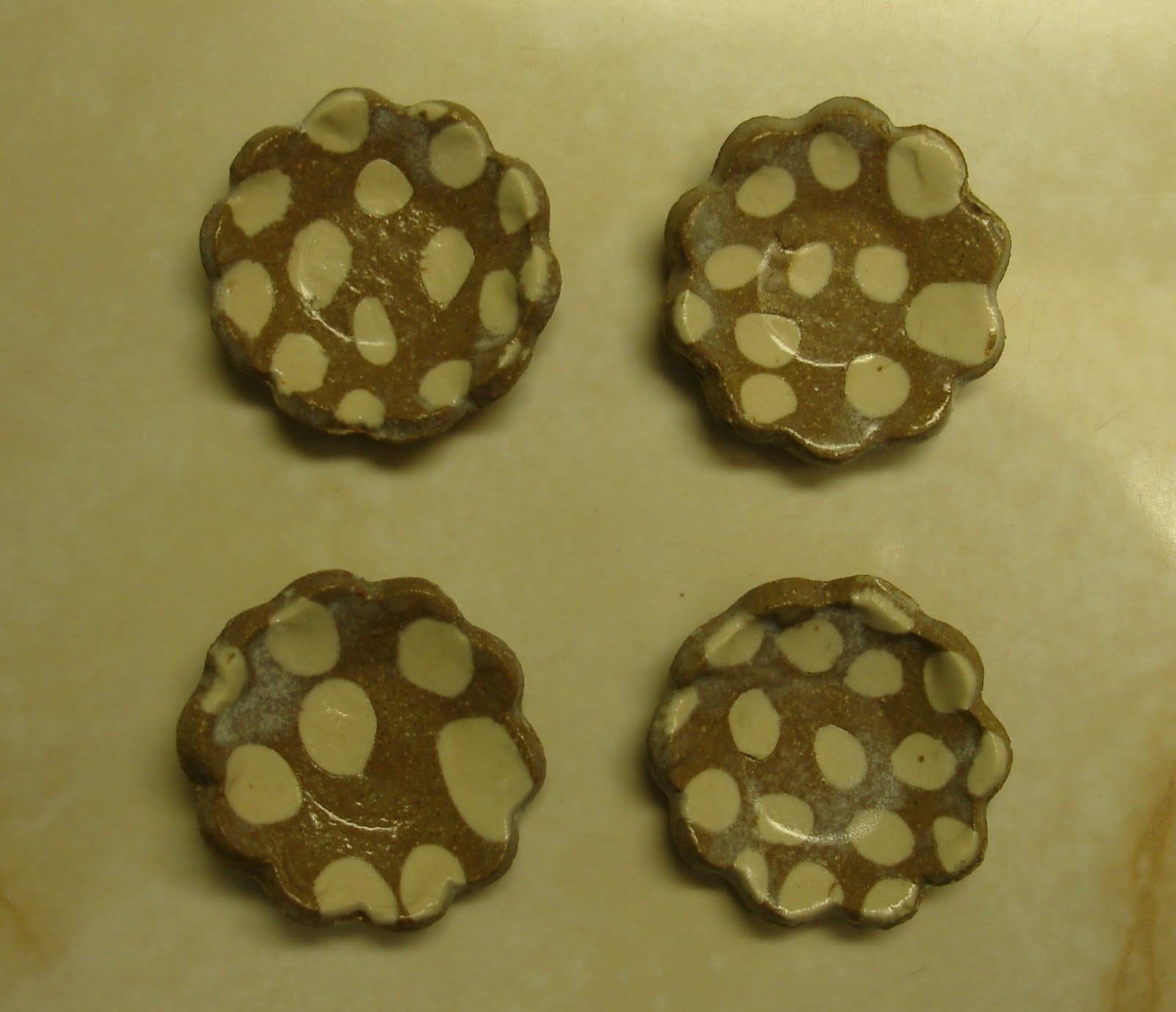 For these four test pieces I inlaid small dots of clay and didn't press as hard to make the bowl shape so there are no cracks. But if you look closely you can see the clear satin glaze is too thick in places. What looks like bubbles in the one test may be clay grit or the glaze may need re-sieving. The pieces feel smooth to my fingers. The final fired thickness is 1/8 inch, that might be a better thickness for inlaid pieces. I do like the sharp contrast between the white and dark stoneware clays.