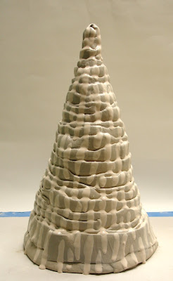 This was going to be a tall tower but somehow it turned into a tone on tone Christmas tree. The tree is about 12 inches tall. I've left a hole in the top for steam to escape during firing. Maybe I'll make a star topper to insert after firing. I've made a plate (drying separately) so the tree could effectively hide a secret treasure. Perhaps milk and cookies for Santa Claus?